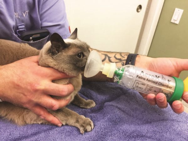 Dar medicación oral a los gatos puede ser una tarea ardua, especialmente en forma de tabletas. La mayoría de las tabletas se pueden combinar en un líquido aromatizado, mejorando la palatabilidad y la facilidad de administración. Una alternativa a la medicación oral es el uso de un inhalador. Los inhaladores de dosis medidas (MDI) se usan comúnmente en humanos asmáticos, lo que permite administrar una alta concentración de medicamentos directamente a los pulmones. Los inhaladores diseñados para humanos requieren coordinar la activación del dispositivo con una inhalación lenta y profunda.
